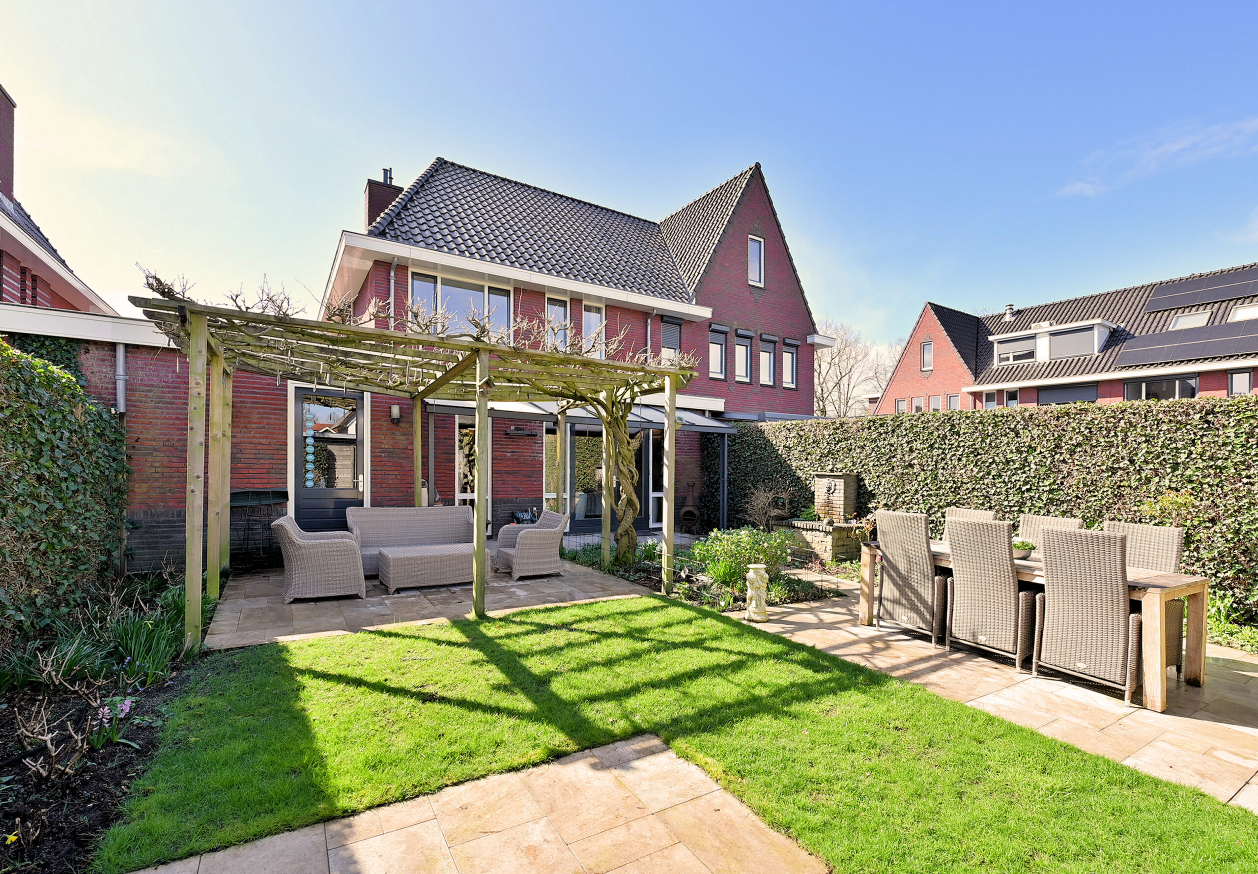 Buitenleven: Een diepe, onder architectuur aangelegde achtertuin met twee terrassen waar u de hele dag van de zon kunt genieten.